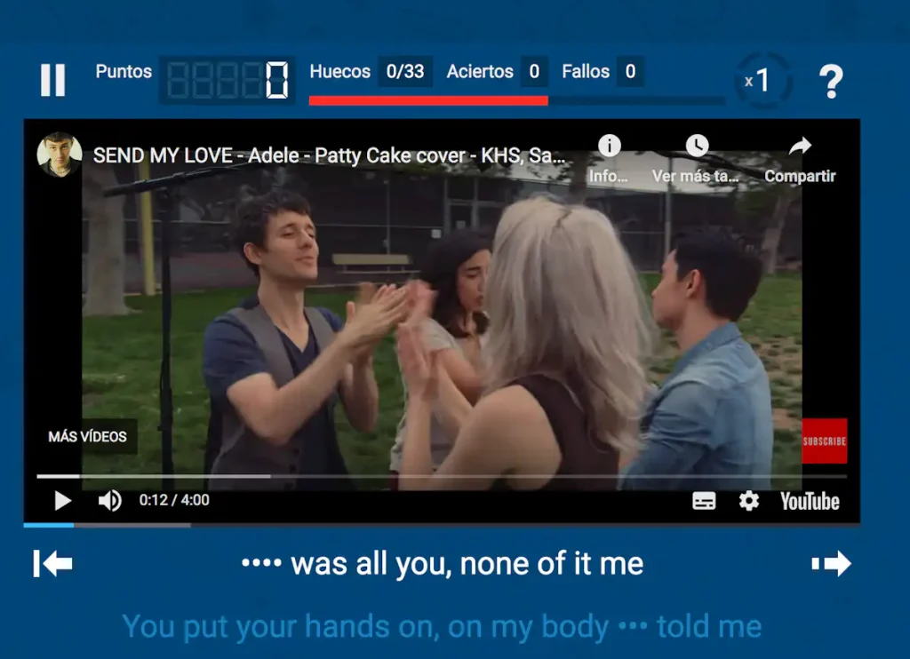 La actividad consiste en rellenar los huecos de las palabras que faltan (se puede escoger entre cuatro niveles de dificultad). La música solo avanza si somos capaces de cumplimentar (tras escuchar el verso) dichos huecos. La tarea resulta un reto divertido y hace que repitamos la escucha en el idioma de la canción (la web ofrece música en trece lenguas). La escucha repetitiva es clave en el aprendizaje de idiomas y, en este caso, se incluye en una tarea amena porque la hacemos con música que hemos escogido, es decir, que disfrutamos.
